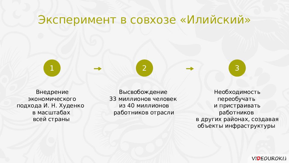 Внедрение экономического подхода И. Н. Худенко в масштабах всей страны Высвобождение 33 миллионов человек из 40 миллионов работников отрасли Необходимость переобучать и пристраивать работников в других районах, создавая объекты инфраструктуры 1 2 3 Эксперимент в совхозе « Илийский »