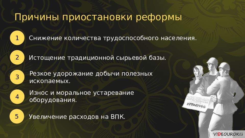 Причины приостановки реформы Снижение количества трудоспособного населения. 1 2 4 Истощение традиционной сырьевой базы. Износ и моральное устаревание оборудования. 3 Резкое удорожание добычи полезных ископаемых. 5 Увеличение расходов на ВПК.