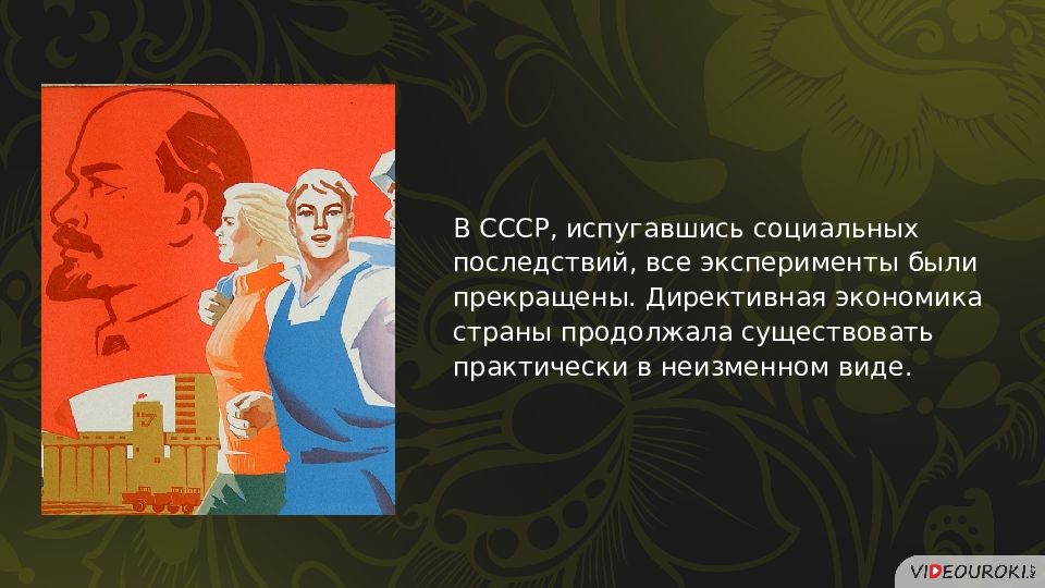 В СССР, испугавшись социальных последствий, все эксперименты были прекращены. Директивная экономика страны продолжала существовать практически в неизменном виде.