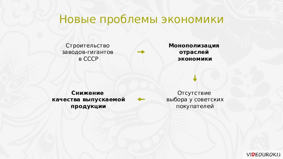 Строительство заводов-гигантов в СССР Монополизация отраслей экономики Отсутствие выбора у советских покупателей Снижение качества выпускаемой продукции Новые проблемы экономики