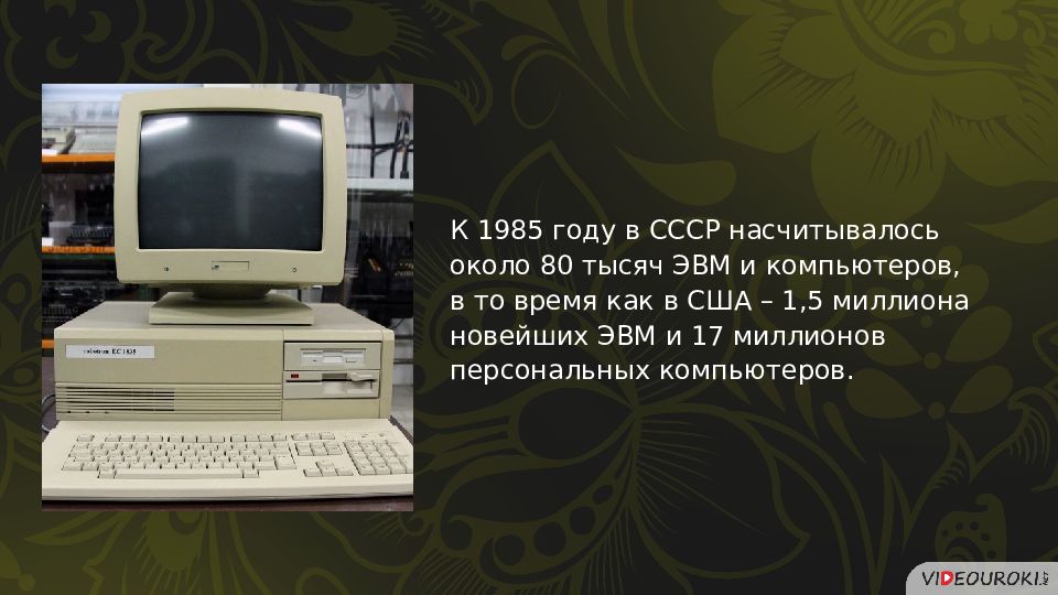 К 1985 году в СССР насчитывалось около 80 тысяч ЭВМ и компьютеров, в то время как в США – 1,5 миллиона новейших ЭВМ и 17 миллионов персональных компьютеров.
