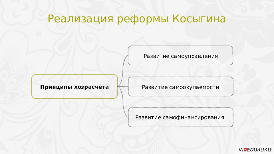Принципы хозрасчёта Развитие самоуправления Развитие самоокупаемости Развитие самофинансирования Реализация реформы Косыгина