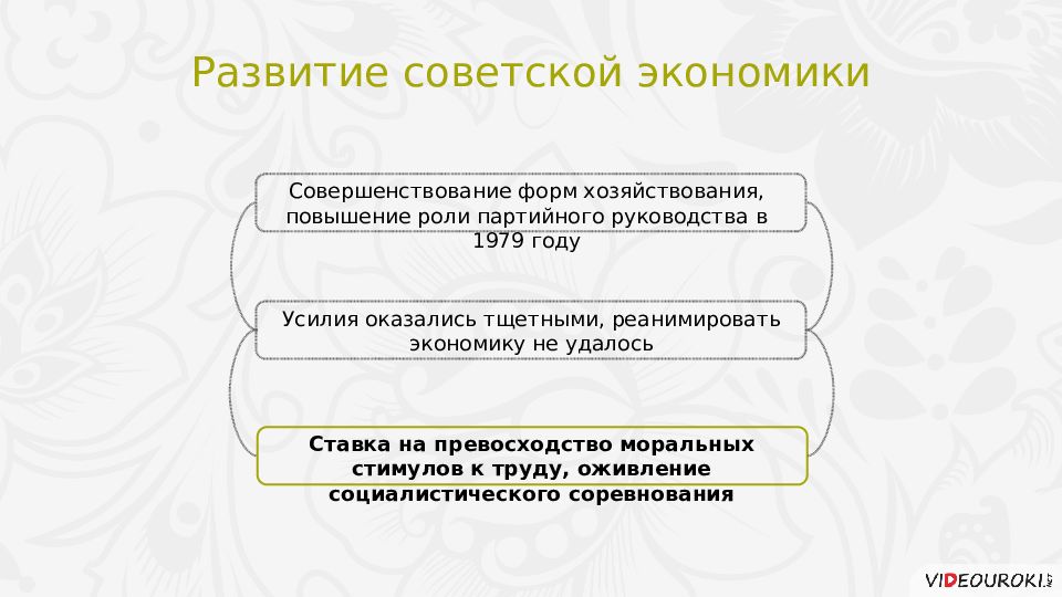 Совершенствование форм хозяйствования, повышение роли партийного руководства в 1979 году Усилия оказались тщетными, реанимировать экономику не удалось Ставка на превосходство моральных стимулов к труду, оживление социалистического соревнования Развитие советской экономики