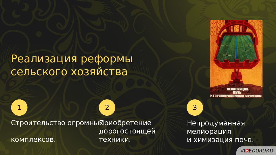 Реализация реформы сельского хозяйства Строительство огромных комплексов. 1 Приобретение дорогостоящей техники. 2 Непродуманная мелиорация и химизация почв. 3