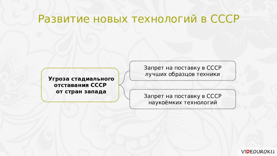 Развитие новых технологий в СССР Угроза стадиального отставания СССР от стран запада Запрет на поставку в СССР лучших образцов техники Запрет на поставку в СССР наукоёмких технологий