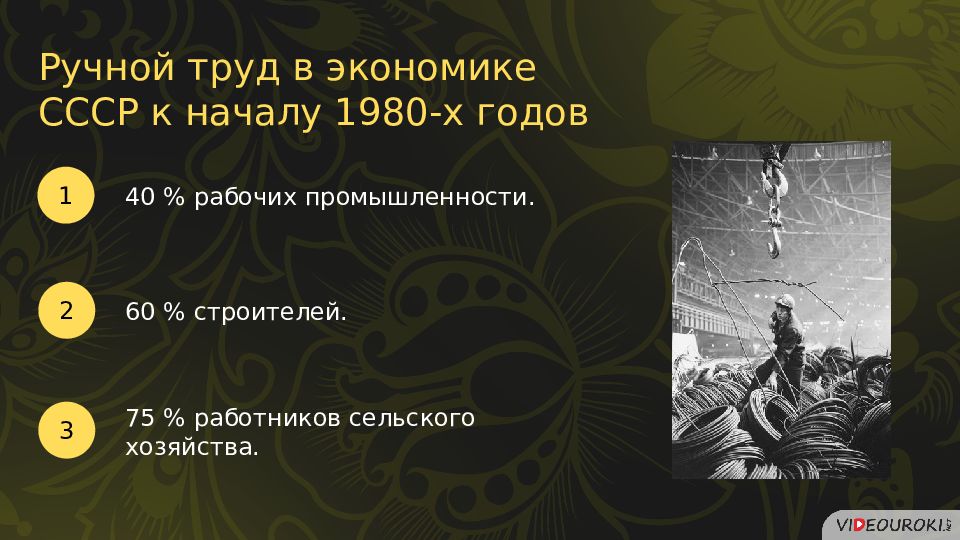 Ручной труд в экономике СССР к началу 1980-х годов 40 % рабочих промышленности. 1 2 60 % строителей. 3 75 % работников сельского хозяйства.