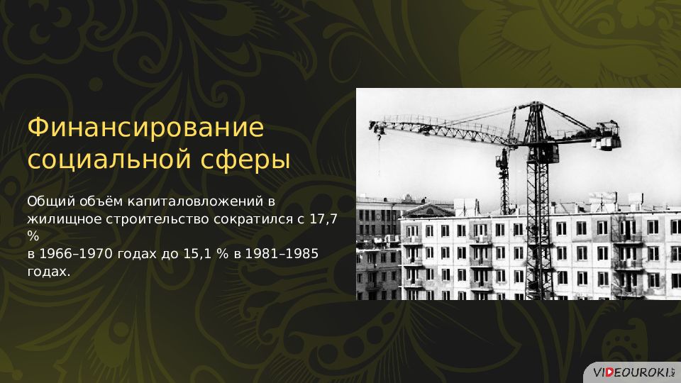 Финансирование социальной сферы Общий объём капиталовложений в жилищное строительство сократился с 17,7 % в 1966–1970 годах до 15,1 % в 1981–1985 годах.