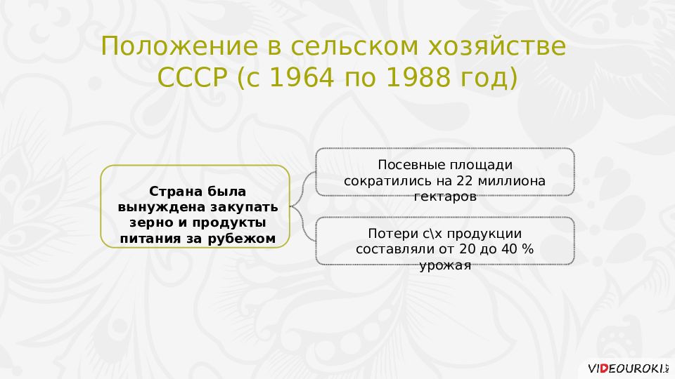 Положение в сельском хозяйстве СССР (с 1964 по 1988 год) Страна была вынуждена закупать зерно и продукты питания за рубежом Посевные площади сократились на 22 миллиона гектаров Потери с\х продукции составляли от 20 до 40 % урожая