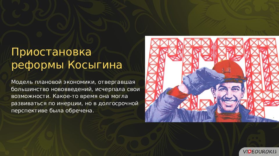 Приостановка реформы Косыгина Модель плановой экономики, отвергавшая большинство нововведений, исчерпала свои возможности. Какое-то время она могла развиваться по инерции, но в долгосрочной перспективе была обречена.