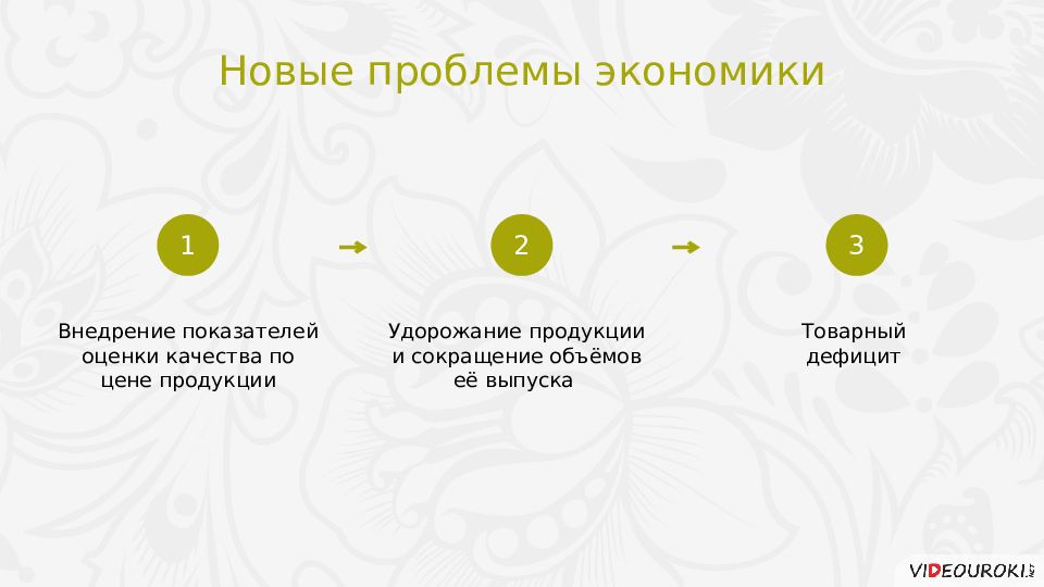 Внедрение показателей оценки качества по цене продукции Удорожание продукции и сокращение объёмов её выпуска Товарный дефицит 1 2 3 Новые проблемы экономики