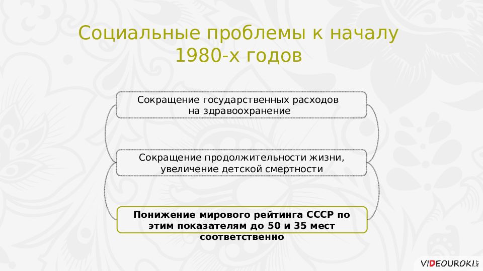 Сокращение государственных расходов на здравоохранение Сокращение продолжительности жизни, увеличение детской смертности Понижение мирового рейтинга СССР по этим показателям до 50 и 35 мест соответственно Социальные проблемы к началу 1980-х годов