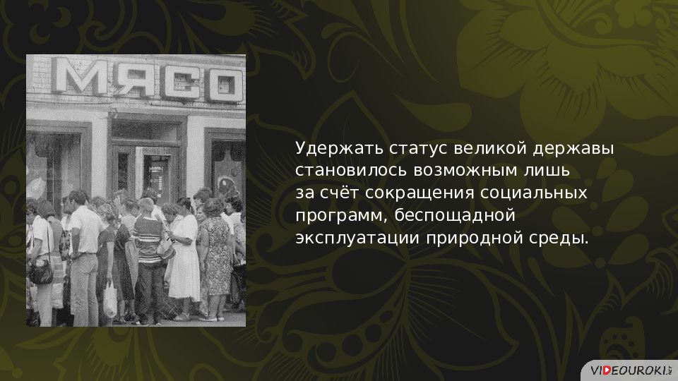 Удержать статус великой державы становилось возможным лишь за счёт сокращения социальных программ, беспощадной эксплуатации природной среды.