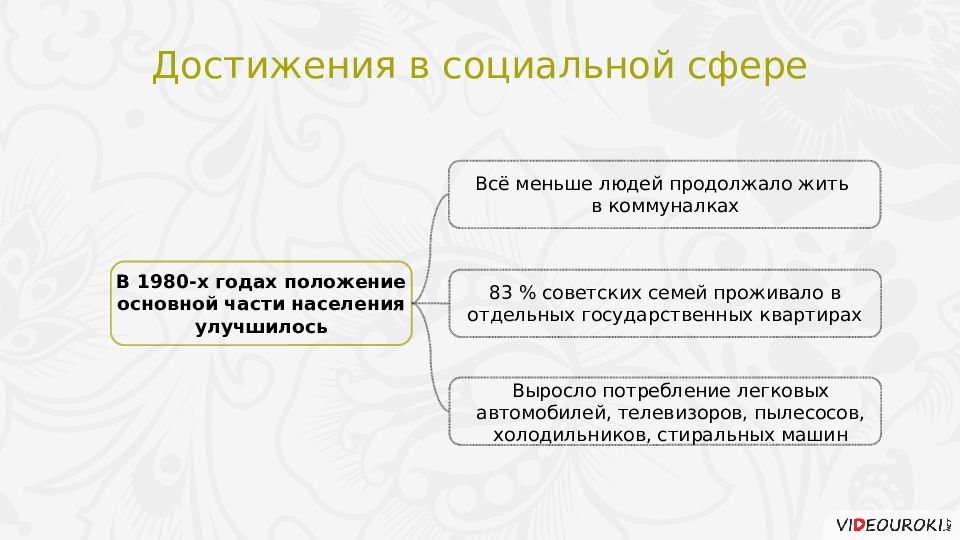 В 1980-х годах положение основной части населения улучшилось Всё меньше людей продолжало жить в коммуналках 83 % советских семей проживало в отдельных государственных квартирах Выросло потребление легковых автомобилей, телевизоров, пылесосов, холодильников, стиральных машин Достижения в социальной сфере