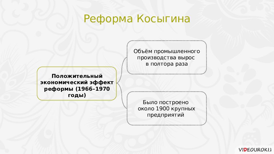 Объём промышленного производства вырос в полтора раза Было построено около 1900 крупных предприятий Положительный экономический эффект реформы (1966–1970 годы) Реформа Косыгина