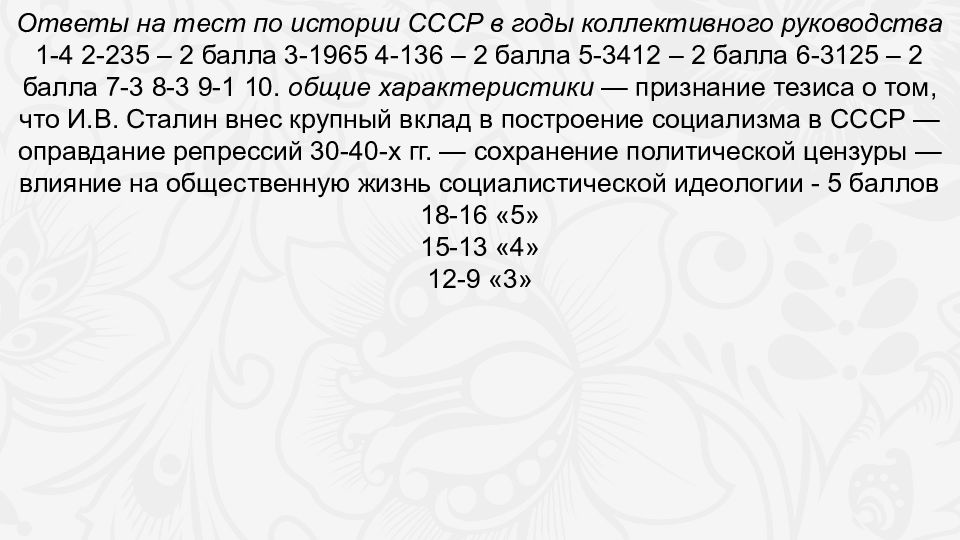 Ответы на тест по истории СССР в годы коллективного руководства 1-4 2-235 – 2 балла 3-1965 4-136 – 2 балла 5-3412 – 2 балла 6-3125 – 2 балла 7-3 8-3 9-1 10. общие характеристики — признание тезиса о том, что И.В. Сталин внес крупный вклад в построение социализма в СССР — оправдание репрессий 30-40-х гг. — сохранение политической цензуры — влияние на общественную жизнь социалистической идеологии - 5 баллов 18-16 «5» 15-13 «4» 12-9 «3»