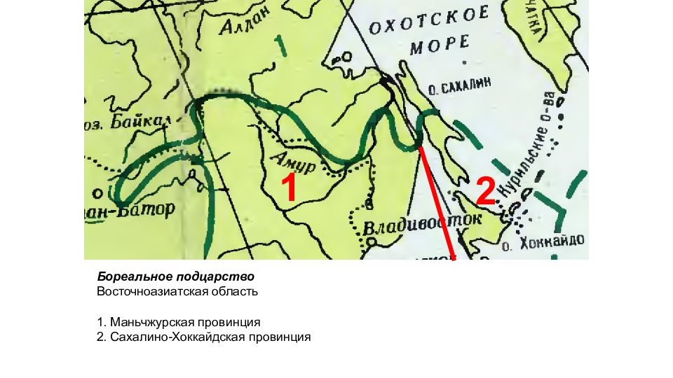 Бореальное подцарство Восточноазиатская область 1. Маньчжурская провинция 2. Сахалино-Хоккайдская провинция 1 2