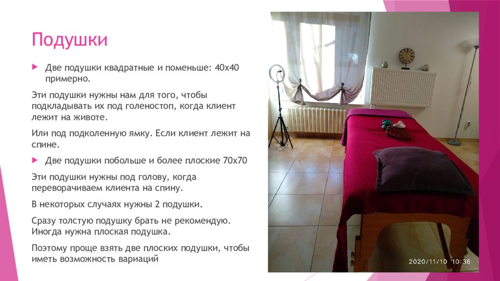 Две подушки квадратные и поменьше: 40х40 примерно. Эти подушки нужны нам для того, чтобы подкладывать их под голеностоп, когда клиент лежит на животе. Или под подколенную ямку. Если клиент лежит на спине. Две подушки побольше и более плоские 70х70 Эти подушки нужны под голову, когда переворачиваем клиента на спину. В некоторых случаях нужны 2 подушки. Сразу толстую подушку брать не рекомендую. Иногда нужна плоская подушка. Поэтому проще взять две плоских подушки, чтобы иметь возможность вариаций