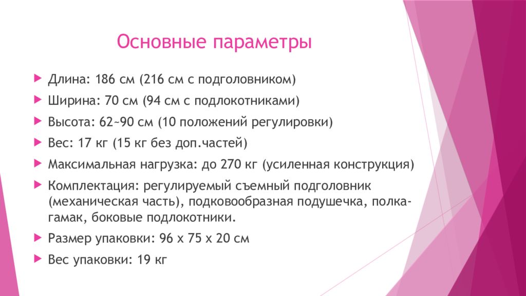 Длина: 186 см (216 см с подголовником) Ширина: 70 см (94 см с подлокотниками) Высота: 62~90 см (10 положений регулировки) Вес: 17 кг (15 кг без доп.частей ) Максимальная нагрузка: до 270 кг (усиленная конструкция) Комплектация: регулируемый съемный подголовник (механическая часть), подковообразная подушечка, полка-гамак, боковые подлокотники. Размер упаковки: 96 х 75 х 20 см Вес упаковки: 19 кг
