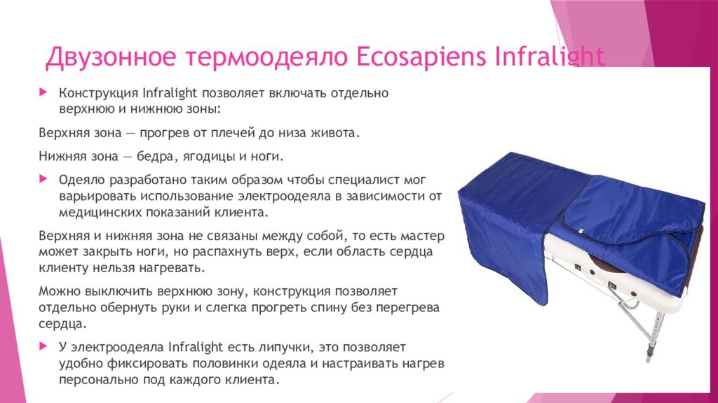 Конструкция Infralight позволяет включать отдельно верхнюю и нижнюю зоны: Верхняя зона — прогрев от плечей до низа живота. Нижняя зона — бедра, ягодицы и ноги. Одеяло разработано таким образом чтобы специалист мог варьировать использование электроодеяла в зависимости от медицинских показаний клиента. Верхняя и нижняя зона не связаны между собой, то есть мастер может закрыть ноги, но распахнуть верх, если область сердца клиенту нельзя нагревать. Можно выключить верхнюю зону, конструкция позволяет отдельно обернуть руки и слегка прогреть спину без перегрева сердца. У электроодеяла Infralight есть липучки, это позволяет удобно фиксировать половинки одеяла и настраивать нагрев персонально под каждого клиента.