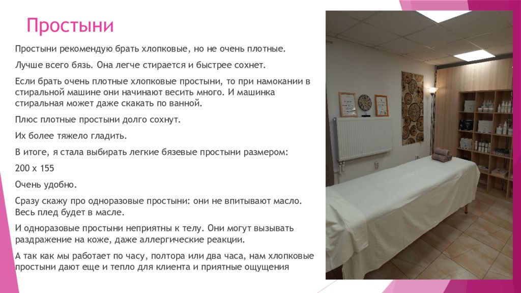 Простыни рекомендую брать хлопковые, но не очень плотные. Лучше всего бязь. Она легче стирается и быстрее сохнет. Если брать очень плотные хлопковые простыни, то при намокании в стиральной машине они начинают весить много. И машинка стиральная может даже скакать по ванной. Плюс плотные простыни долго сохнут. Их более тяжело гладить. В итоге, я стала выбирать легкие бязевые простыни размером: 200 х 155 Очень удобно. Сразу скажу про одноразовые простыни: они не впитывают масло. Весь плед будет в масле. И одноразовые простыни неприятны к телу. Они могут вызывать раздражение на коже, даже аллергические реакции. А так как мы работает по часу, полтора или два часа, нам хлопковые простыни дают еще и тепло для клиента и приятные ощущения