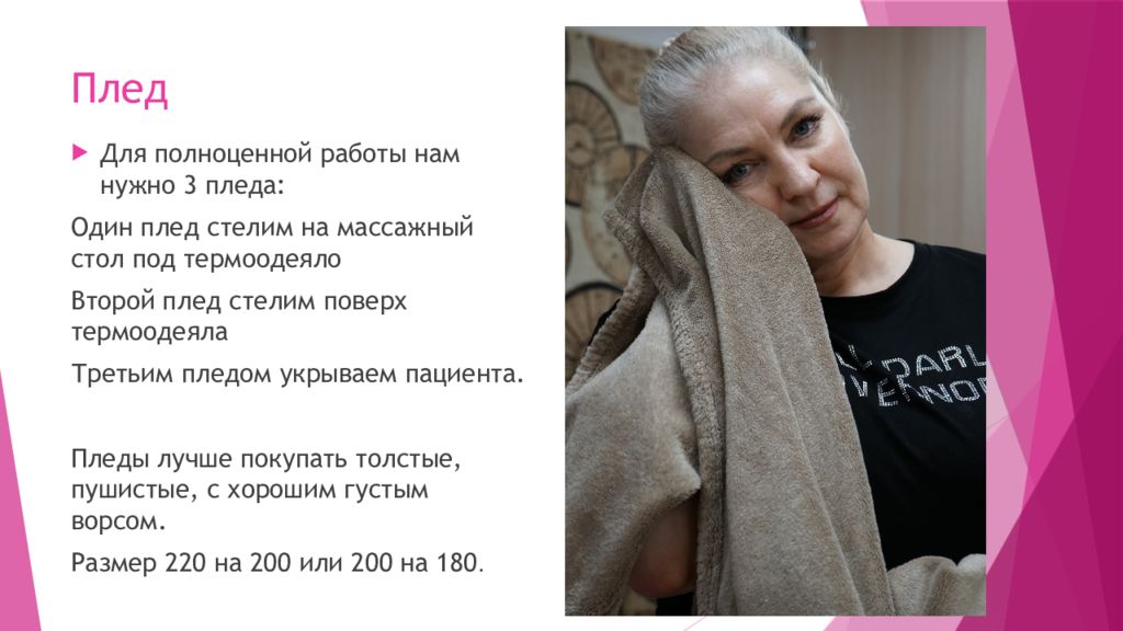 Для полноценной работы нам нужно 3 пледа: Один плед стелим на массажный стол под термоодеяло Второй плед стелим поверх термоодеяла Третьим пледом укрываем пациента. Пледы лучше покупать толстые, пушистые, с хорошим густым ворсом. Размер 220 на 200 или 200 на 180.