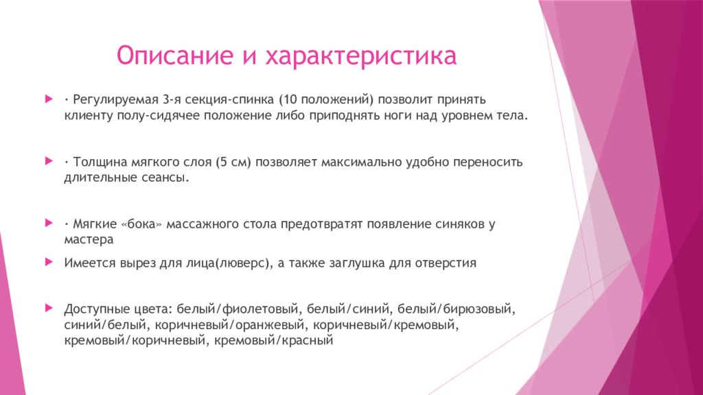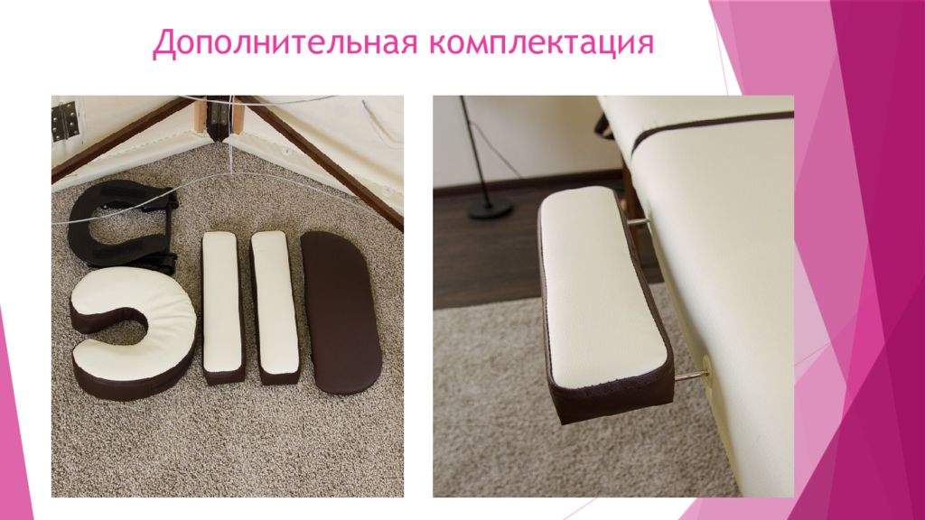 · Регулируемая 3-я секция-спинка (10 положений) позволит принять клиенту полу-сидячее положение либо приподнять ноги над уровнем тела. · Толщина мягкого слоя (5 см) позволяет максимально удобно переносить длительные сеансы. · Мягкие «бока» массажного стола предотвратят появление синяков у мастера Имеется вырез для лица(люверс), а также заглушка для отверстия Доступные цвета: белый/фиолетовый, белый/синий, белый/бирюзовый, синий/белый, коричневый/оранжевый, коричневый/кремовый, кремовый/коричневый, кремовый/красный