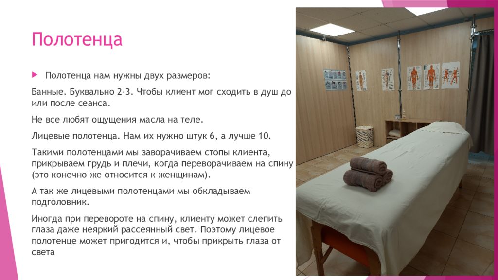 Полотенца нам нужны двух размеров: Банные. Буквально 2-3. Чтобы клиент мог сходить в душ до или после сеанса. Не все любят ощущения масла на теле. Лицевые полотенца. Нам их нужно штук 6, а лучше 10. Такими полотенцами мы заворачиваем стопы клиента, прикрываем грудь и плечи, когда переворачиваем на спину (это конечно же относится к женщинам). А так же лицевыми полотенцами мы обкладываем подголовник. Иногда при перевороте на спину, клиенту может слепить глаза даже неяркий рассеянный свет. Поэтому лицевое полотенце может пригодится и, чтобы прикрыть глаза от света