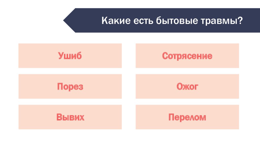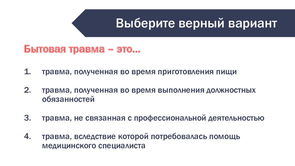 Последний слайд презентации: Что такое бытовые травмы?: Выберите верный вариант