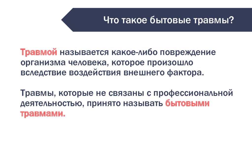Бытовая травма – это… травма, полученная во время приготовления пищи травма, полученная во время выполнения должностных обязанностей травма, не связанная с профессиональной деятельностью травма, вследствие которой потребовалась помощь медицинского специалиста