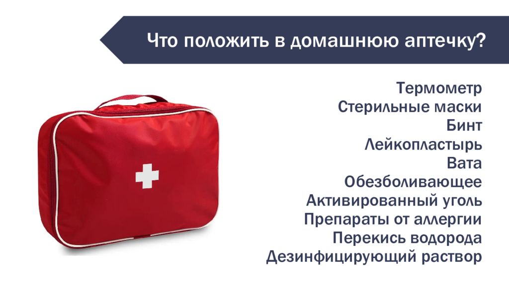 Термометр Стерильные маски Бинт Лейкопластырь Вата Обезболивающее Активированный уголь Препараты от аллергии Перекись водорода Дезинфицирующий раствор