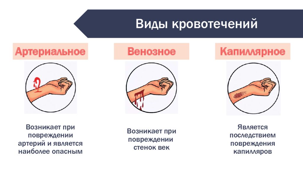Артериальное Венозное Капиллярное Возникает при повреждении артерий и является наиболее опасным Возникает при повреждении стенок век Является последствием повреждения капилляров