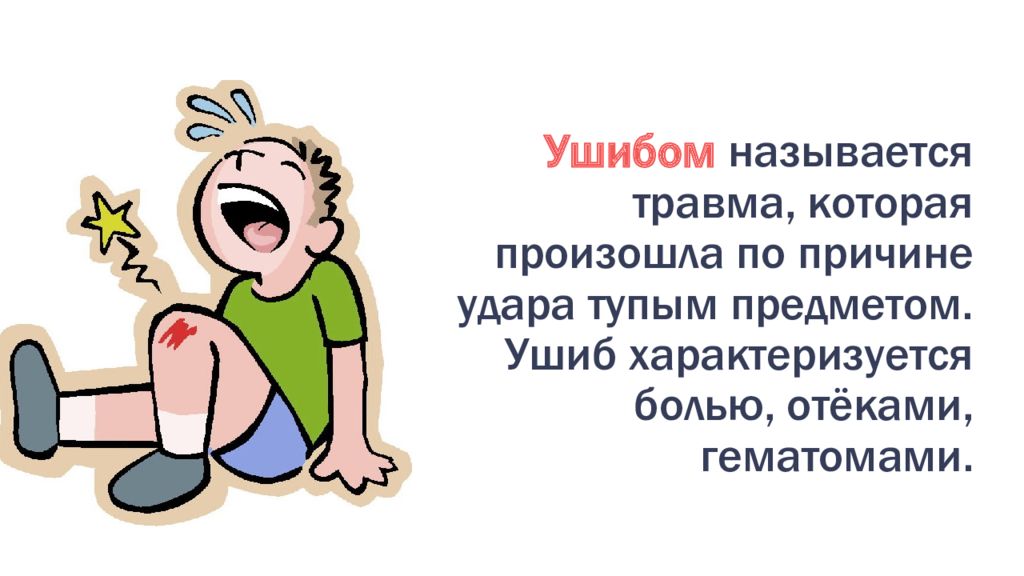 Ушибом называется травма, которая произошла по причине удара тупым предметом. Ушиб характеризуется болью, отёками, гематомами.