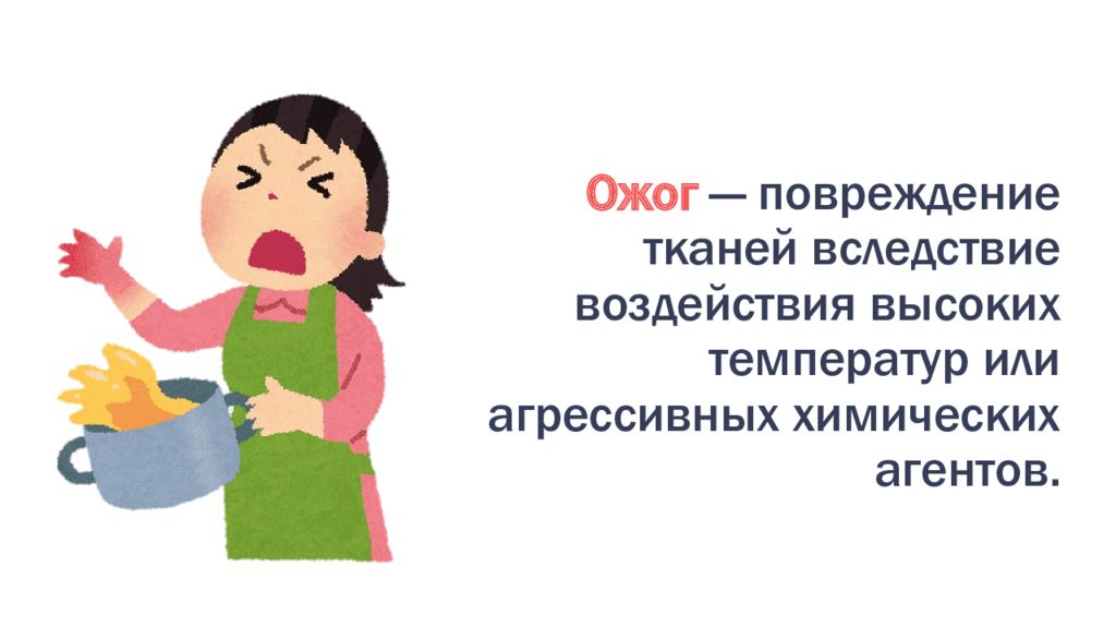 Ожог — повреждение тканей вследствие воздействия высоких температур или агрессивных химических агентов.