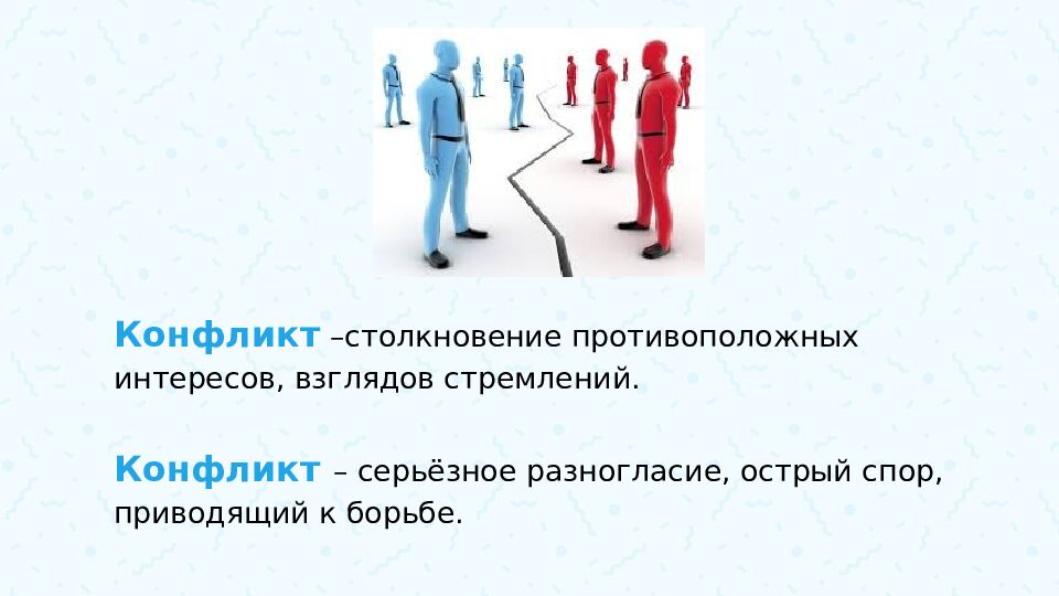 Конфликт –столкновение противоположных интересов, взглядов стремлений. Конфликт – серьёзное разногласие, острый спор, приводящий к борьбе.