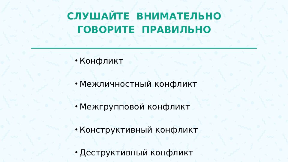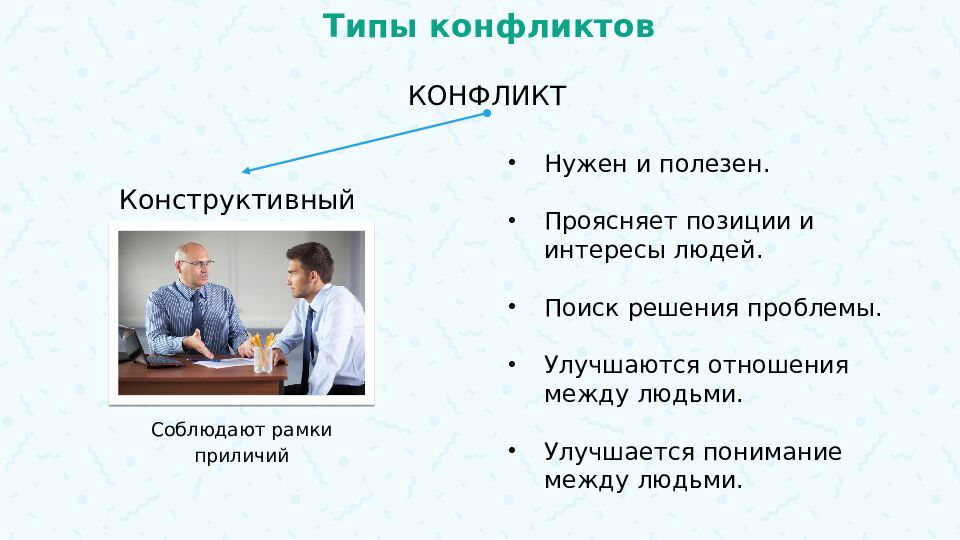 КОНФЛИКТ Конструктивный Соблюдают рамки приличий Типы конфликтов Нужен и полезен. Проясняет позиции и интересы людей. Поиск решения проблемы. Улучшаются отношения между людьми. Улучшается понимание между людьми.