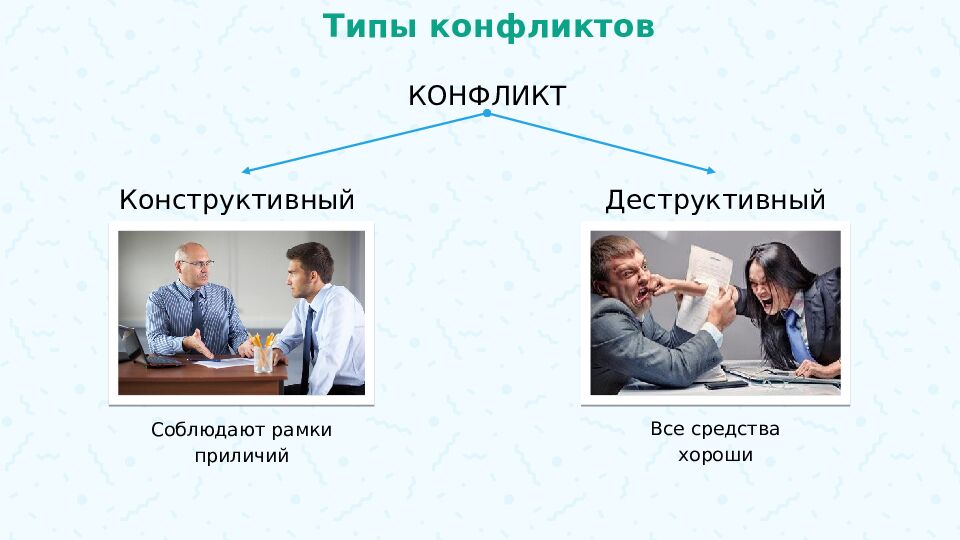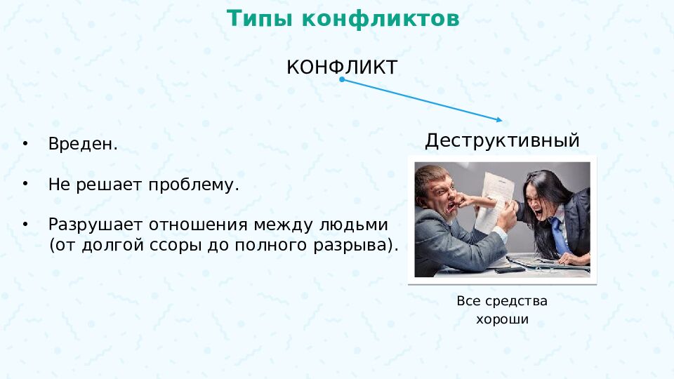 КОНФЛИКТ Де структивный Все средства хороши Типы конфликтов Вреден. Не решает проблему. Разрушает отношения между людьми (от долгой ссоры до полного разрыва).