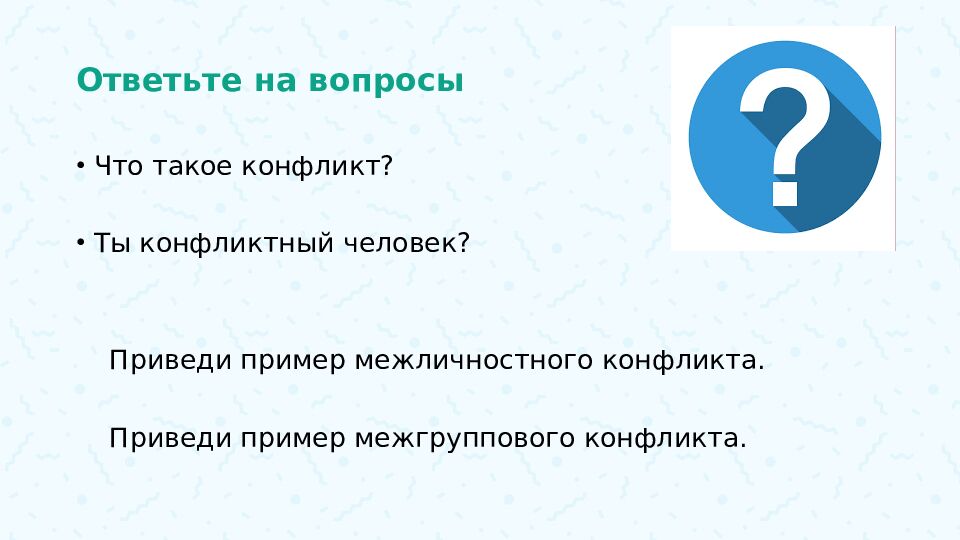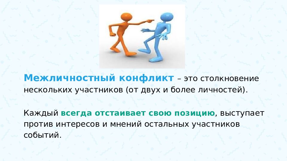 Межличностный конфликт – это столкновение нескольких участников (от двух и более личностей ). К аждый всегда отстаивает свою позицию, выступает против интересов и мнений остальных участников событий.