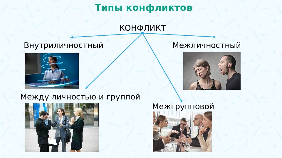 КОНФЛИКТ Внутриличностный Межличностный Типы конфликтов Между личностью и группой Межгрупповой