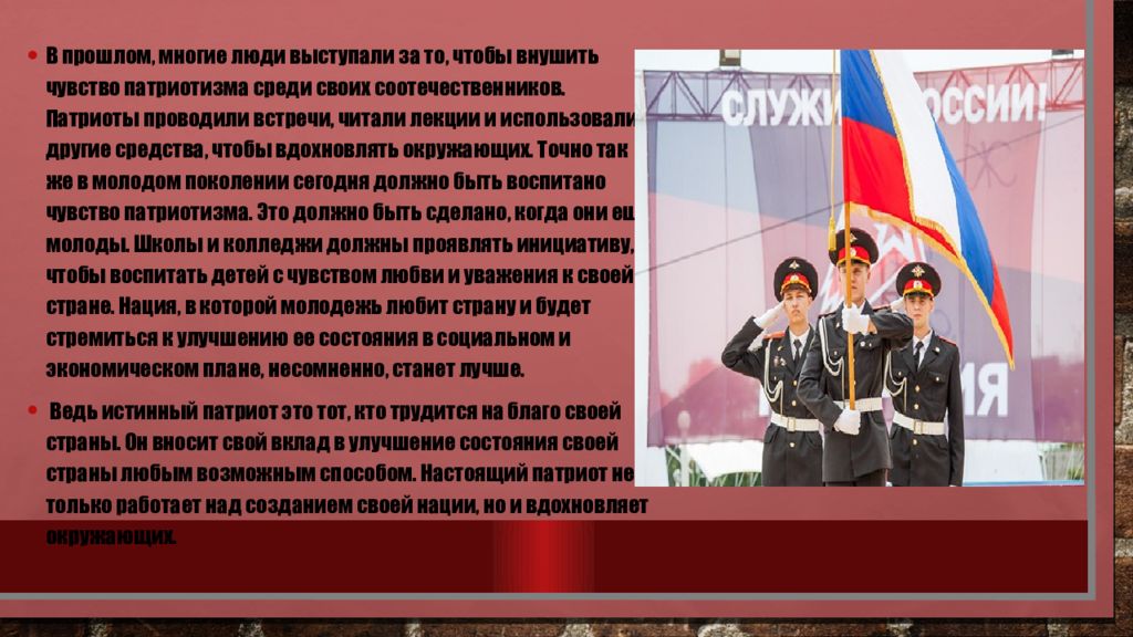 В прошлом, многие люди выступали за то, чтобы внушить чувство патриотизма среди своих соотечественников. Патриоты проводили встречи, читали лекции и использовали другие средства, чтобы вдохновлять окружающих. Точно так же в молодом поколении сегодня должно быть воспитано чувство патриотизма. Это должно быть сделано, когда они еще молоды. Школы и колледжи должны проявлять инициативу, чтобы воспитать детей с чувством любви и уважения к своей стране. Нация, в которой молодежь любит страну и будет стремиться к улучшению ее состояния в социальном и экономическом плане, несомненно, станет лучше. Ведь истинный патриот это тот, кто трудится на благо своей страны. Он вносит свой вклад в улучшение состояния своей страны любым возможным способом. Настоящий патриот не только работает над созданием своей нации, но и вдохновляет окружающих.