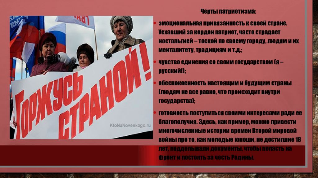 Черты патриотизма: эмоциональная привязанность к своей стране. Уехавший за кордон патриот, часто страдает ностальгией – тоской по своему городу, людям и их менталитету, традициям и т.д.; чувство единения со своим государством (я – русский!); обеспокоенность настоящим и будущим страны (людям не все равно, что происходит внутри государства); готовность поступиться своими интересами ради ее благополучия. Здесь, как пример, можно привести многочисленные истории времен Второй мировой войны про то, как молодые юноши, не достигшие 18 лет, подделывали документы, чтобы попасть на фронт и постоять за честь Родины.