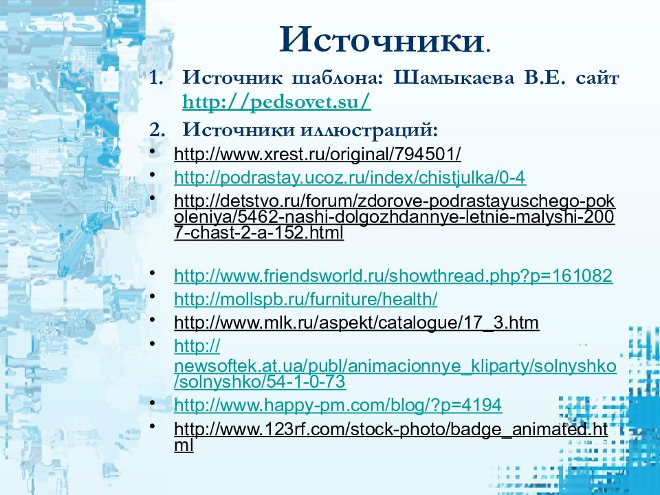 Источники. Источник шаблона: Шамыкаева В.Е. сайт http://pedsovet.su/ Источники иллюстраций: http://www.xrest.ru/original/794501/ http:// podrastay.ucoz.ru/index/chistjulka/0-4 http://detstvo.ru/forum/zdorove-podrastayuschego-pokoleniya/5462-nashi-dolgozhdannye-letnie-malyshi-2007-chast-2-a-152.html http:// www.friendsworld.ru/showthread.php?p=161082 http://mollspb.ru/furniture/health / http://www.mlk.ru/aspekt/catalogue/17_3.htm http :// newsoftek.at.ua/publ/animacionnye_kliparty/solnyshko/solnyshko/54-1-0-73 http://www.happy-pm.com/blog/? p=4194 http://www.123rf.com/stock-photo/badge_animated.html