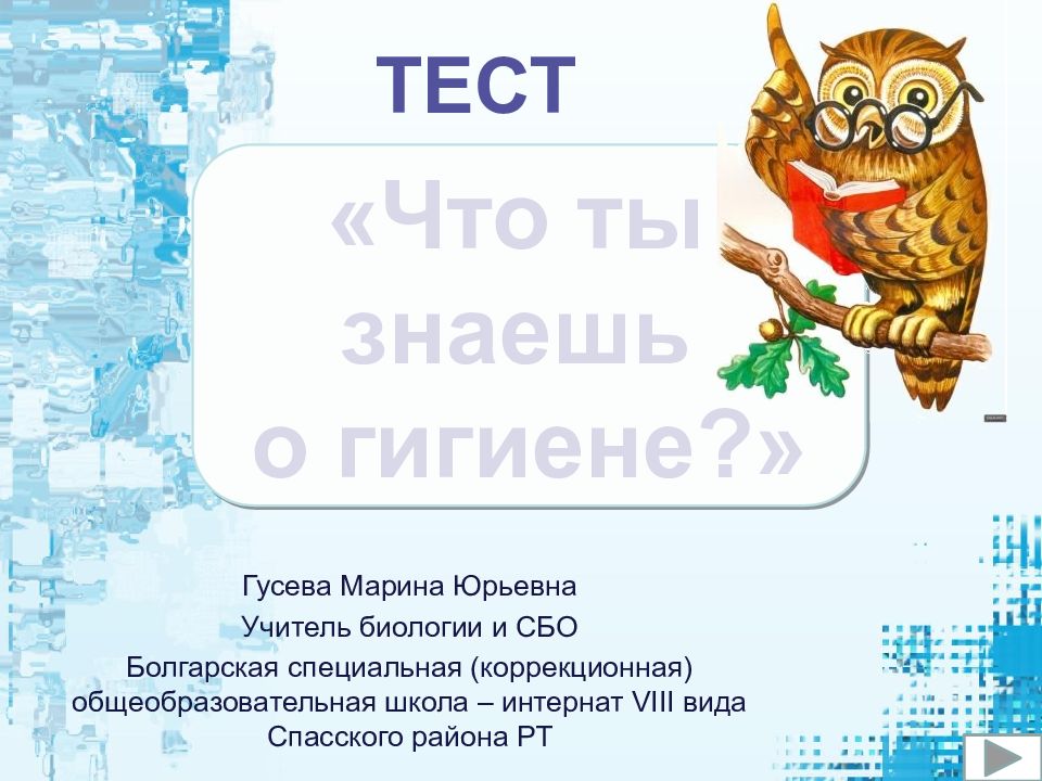 «Что ты знаешь о гигиене?» ТЕСТ Гусева Марина Юрьевна Учитель биологии и СБО Болгарская специальная (коррекционная) общеобразовательная школа – интернат VIII вида Спасского района РТ