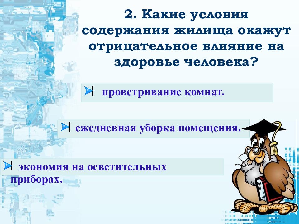 2. Какие условия содержания жилища окажут отрицательное влияние на здоровье человека? экономия на осветительных приборах. ежедневная уборка помещения. проветривание комнат.