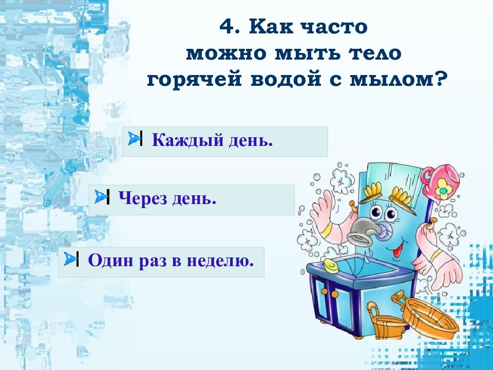 4. Как часто можно мыть тело горячей водой с мылом? Один раз в неделю. Через день. Каждый день.