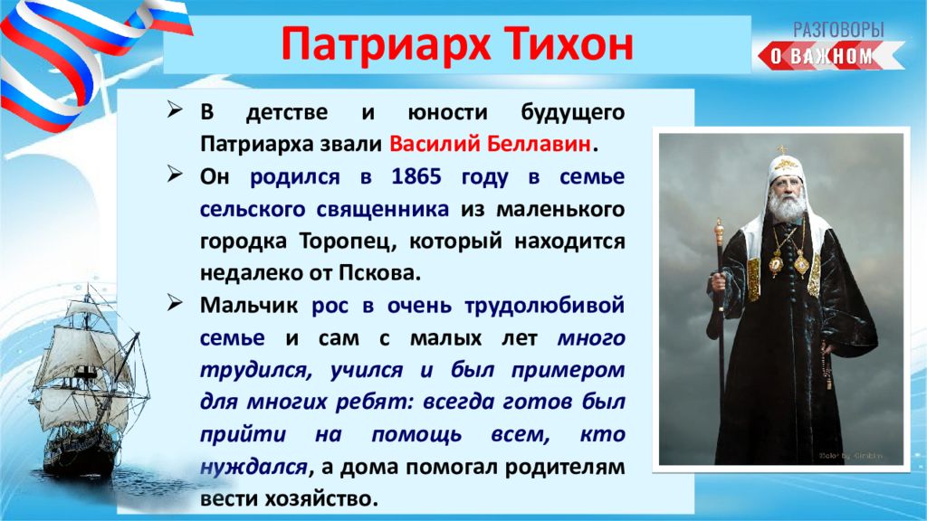 В детстве и юности будущего Патриарха звали Василий Беллавин. Он родился в 1865 году в семье сельского священника из маленького городка Торопец, который находится недалеко от Пскова. Мальчик рос в очень трудолюбивой семье и сам с малых лет много трудился, учился и был примером для многих ребят: всегда готов был прийти на помощь всем, кто нуждался, а дома помогал родителям вести хозяйство. Патриарх Тихон