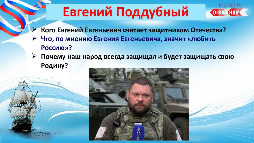 Кого Евгений Евгеньевич считает защитником Отечества ? Что, по мнению Евгения Евгеньевича, значит «любить Россию»? Почему наш народ всегда защищал и будет защищать свою Родину?