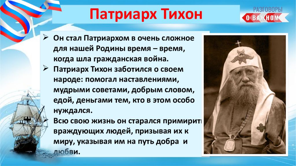 Он стал Патриархом в очень сложное для нашей Родины время – время, когда шла гражданская война. Патриарх Тихон заботился о своем народе: помогал наставлениями, мудрыми советами, добрым словом, едой, деньгами тем, кто в этом особо нуждался. Всю свою жизнь он старался примирить враждующих людей, призывая их к миру, указывая им на путь добра и любви. Патриарх Тихон