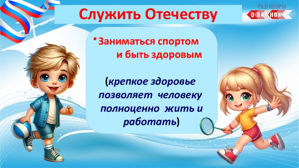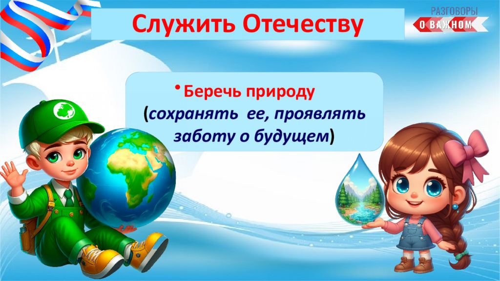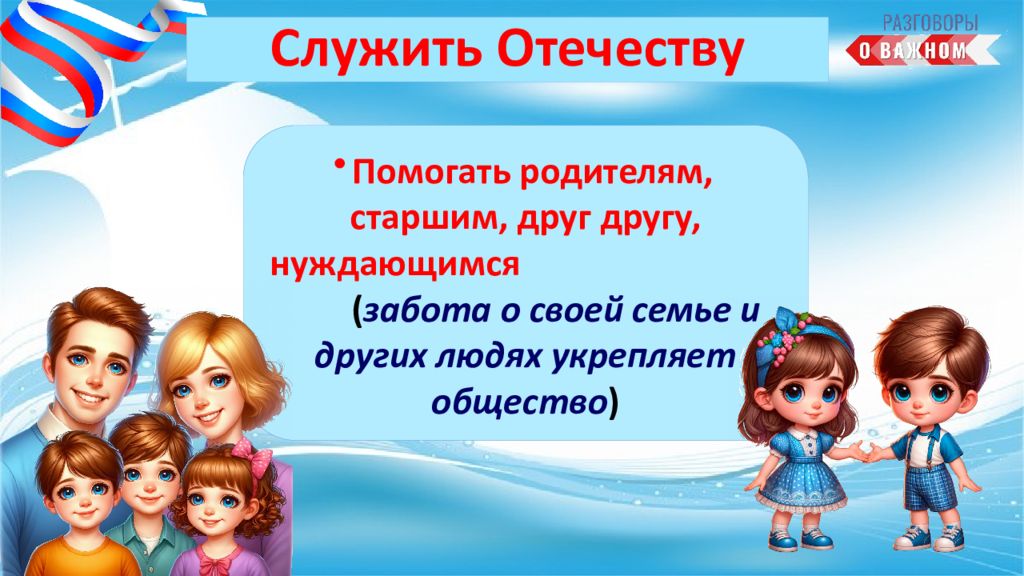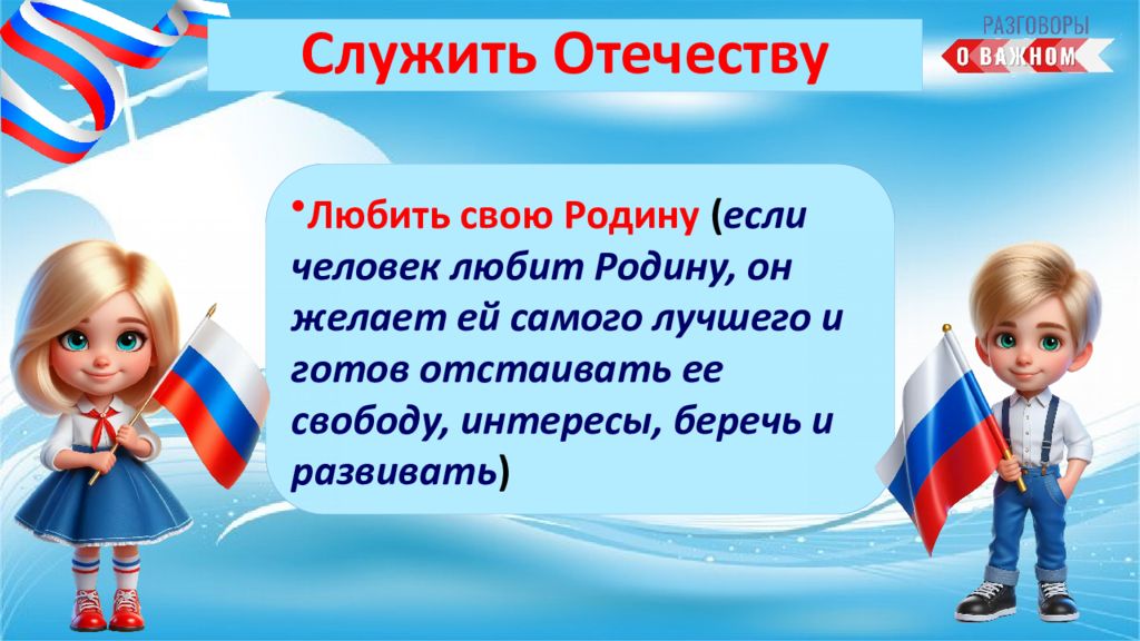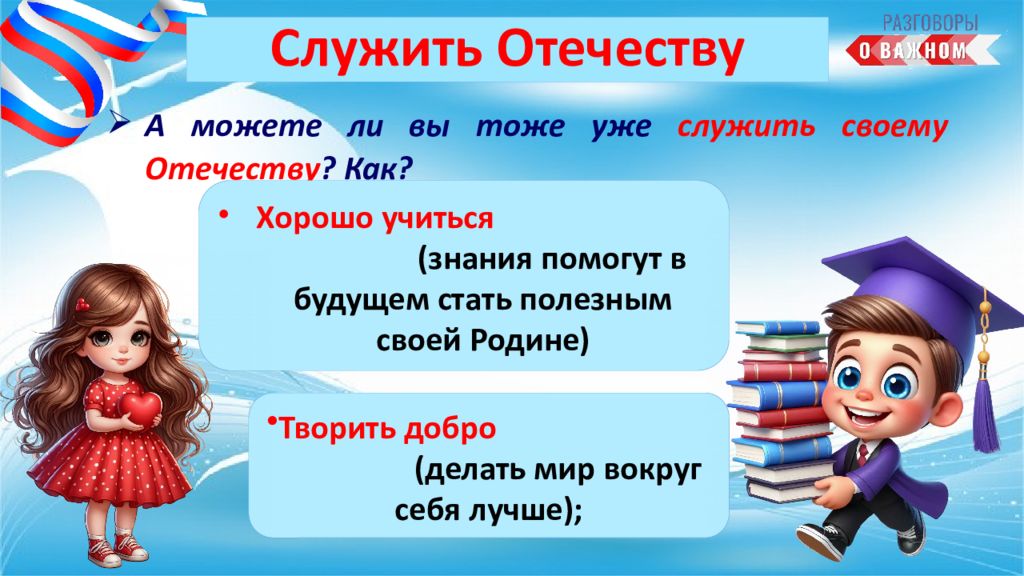 А можете ли вы тоже уже служить своему Отечеству ? Как? Творить добро (делать мир вокруг себя лучше); Хорошо учиться (знания помогут в будущем стать полезным своей Родине)