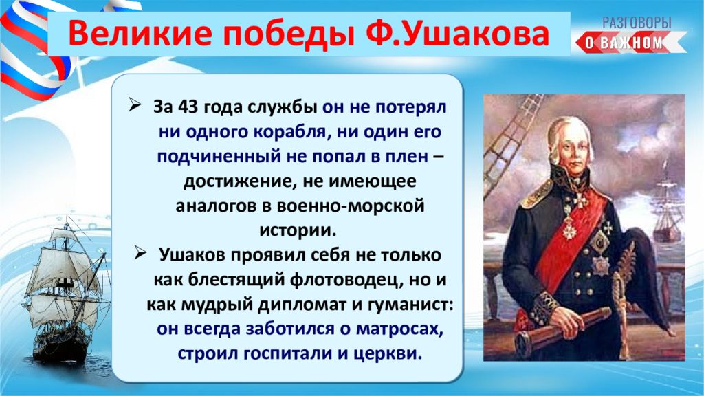 За 43 года службы он не потерял ни одного корабля, ни один его подчиненный не попал в плен – достижение, не имеющее аналогов в военно-морской истории. Ушаков проявил себя не только как блестящий флотоводец, но и как мудрый дипломат и гуманист : он всегда заботился о матросах, строил госпитали и церкви.