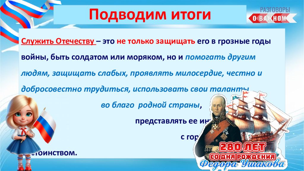 Служить Отечеству – это не только защищать его в грозные годы войны, быть солдатом или моряком, но и помогать другим людям, защищать слабых, проявлять милосердие, честно и добросовестно трудиться, использовать свои таланты во благо родной страны, представлять ее интересы в мире с гордостью и достоинством. Подводим итоги